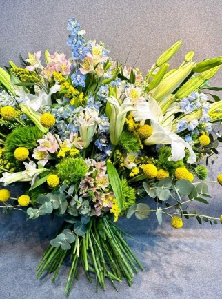 Lilyum, grintrik, delfinyum, crespedium, astromeria çiçeklerinin zarif birleşimiyle hazırlanan bu dolgun büyük buket, her ortamda göz alıcı bir etki yaratır. Canlı renklerin ve farklı çiçeklerin uyumu, doğal yeşillikler ile tamamlanarak zarif ve sofistike bir tasarım oluşturur. Buketin geniş ve dolg..
